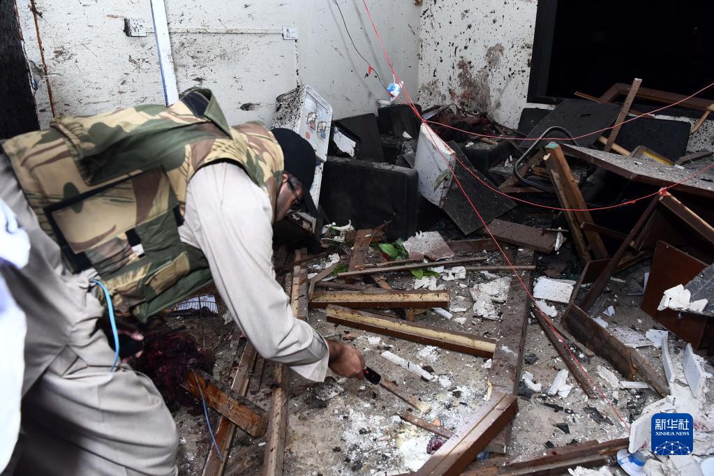 2月17日,在巴基斯坦卡拉奇,安全人員檢查遇襲警察局現場(chǎng)。