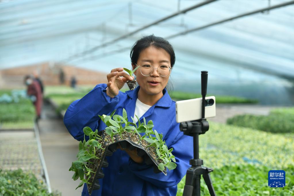 2月17日,張莎莎在育苗棚內通過(guò)直播的方式推介產(chǎn)品。