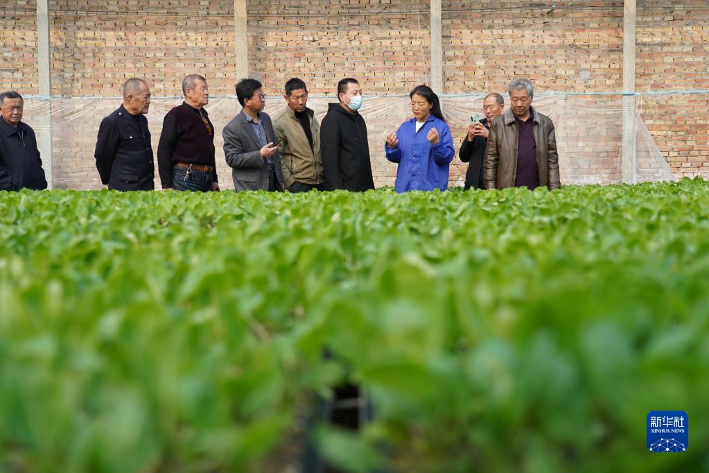2月17日,張莎莎(右三)為前來(lái)參觀(guān)學(xué)習的外縣群眾講解秧苗培育技巧。