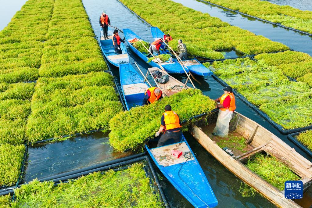 2月17日,浙江省杭州市淳安縣千島湖鎮坪山生態(tài)浮島上,工作人員忙著(zhù)采摘水生蔬菜(無(wú)人機照片)。