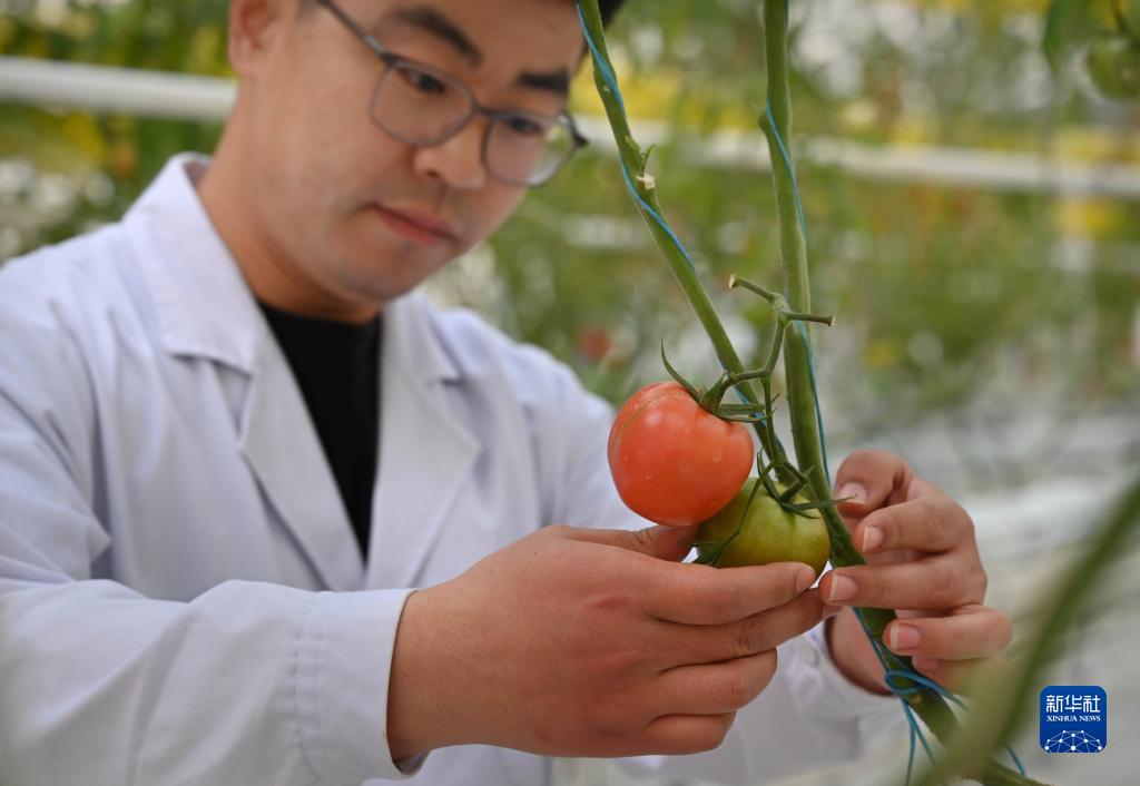 在蘭考縣儀封鎮水木焦桐都市農業(yè)綜合體項目車(chē)間里,技術(shù)人員在查看番茄長(cháng)勢(2月16日攝)。