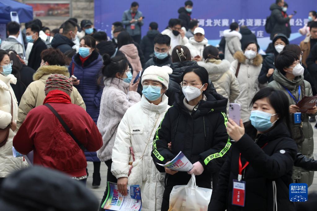 2月18日,在河北省藝術(shù)中心文化廣場(chǎng),求職者在招聘活動(dòng)現場(chǎng)尋找工作機會(huì )。