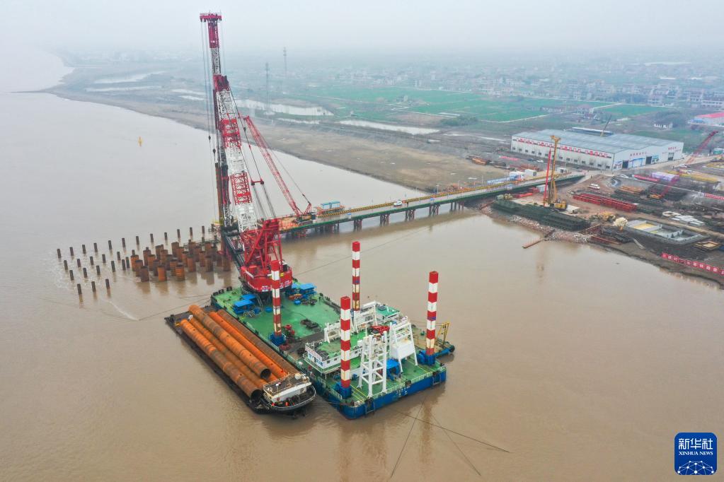這是2月18日拍攝的崇啟公鐵長(cháng)江大橋永久鋼護筒施打作業(yè)現場(chǎng)(無(wú)人機照片)。