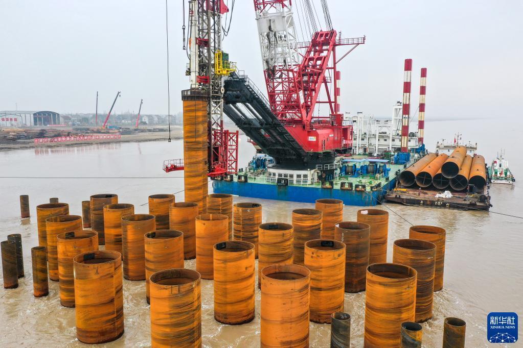 這是2月18日拍攝的崇啟公鐵長(cháng)江大橋永久鋼護筒施打作業(yè)現場(chǎng)(無(wú)人機照片)。
