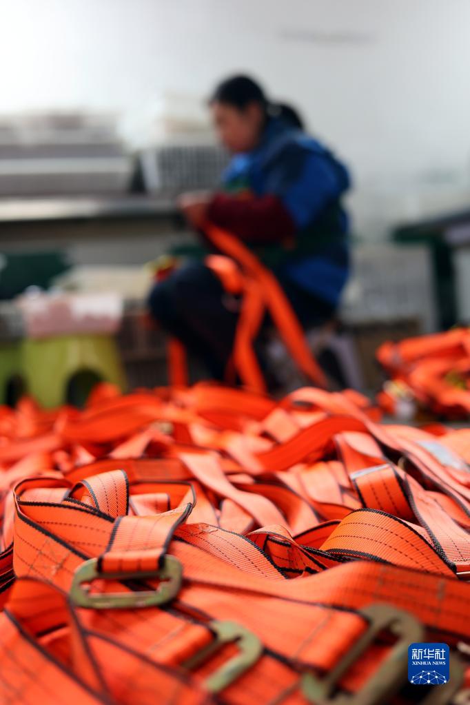 2月18日,山東省濱州市惠民縣姜樓鎮一家繩網(wǎng)企業(yè)工人在趕制一批來(lái)自國外的安全帶訂單。