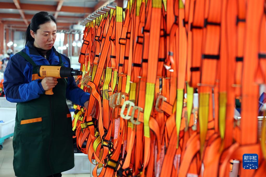 2月18日,山東省濱州市惠民縣姜樓鎮一家繩網(wǎng)企業(yè)工人在修整出廠(chǎng)的安全帶。