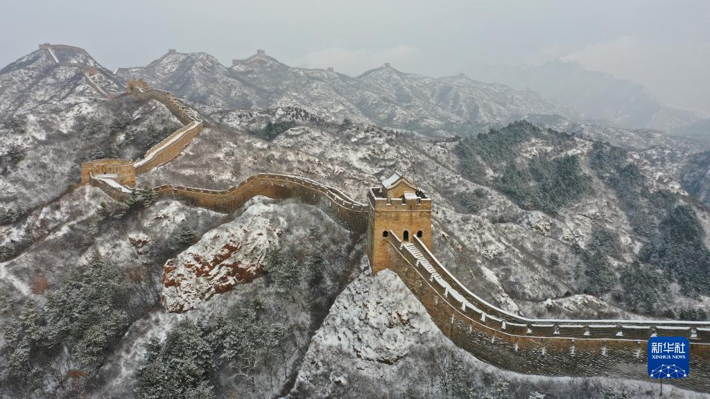 這是2月18日拍攝的位于河北省承德市灤平縣的金山嶺長(cháng)城雪景(無(wú)人機照片)。