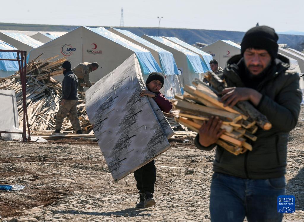 2月18日,在土耳其南部阿德亞曼省阿德亞曼市,人們搬運物品。