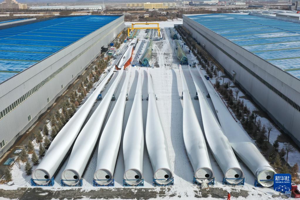 這是2月18日在武威市涼州區一家風(fēng)電裝備生產(chǎn)企業(yè)拍攝的風(fēng)機葉片成品(無(wú)人機照片)。