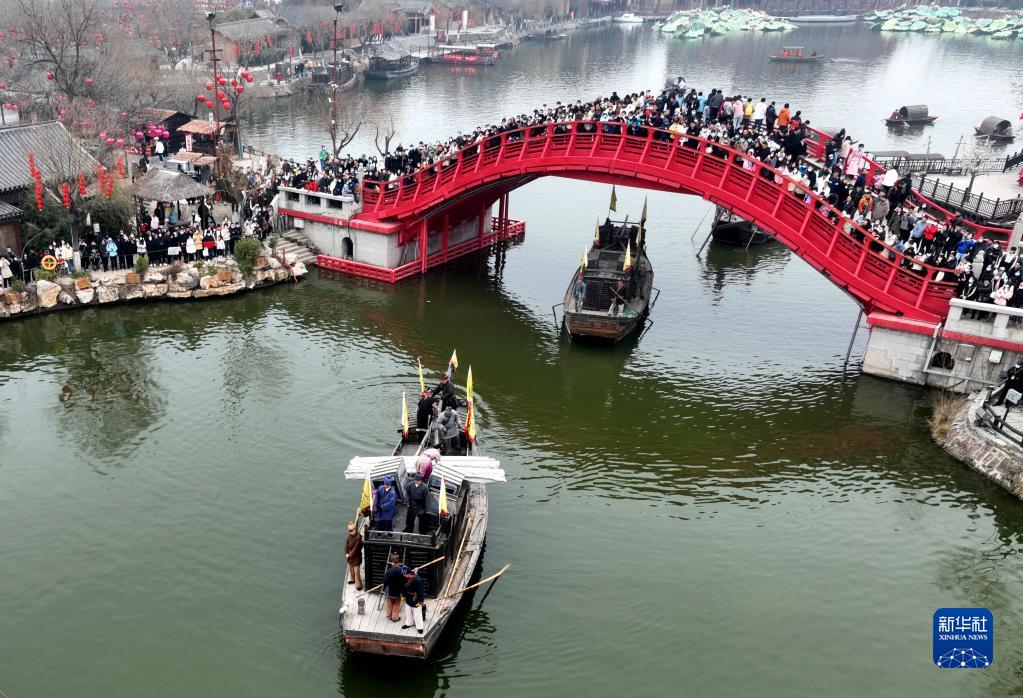 2月18日,游客在開(kāi)封清明上河園景區內游玩(無(wú)人機照片)。