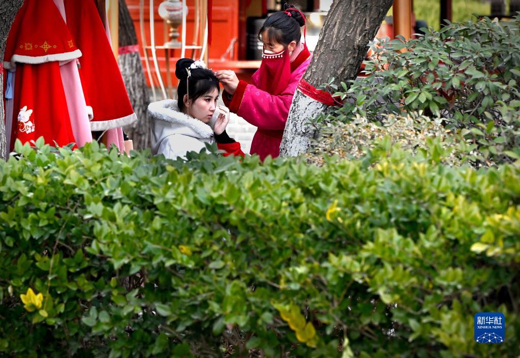 游客在開(kāi)封清明上河園景區內穿傳統服飾(2月14日攝)。