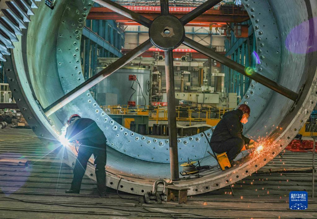工人在位于遼寧省沈陽(yáng)市的北方重工有限公司車(chē)間焊接零部件(1月13日攝)。