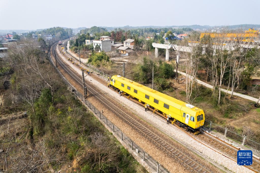 2月19日,在滬昆鐵路婁底至湘潭東區間,一輛快速換軌車(chē)正在施工(無(wú)人機照片)。