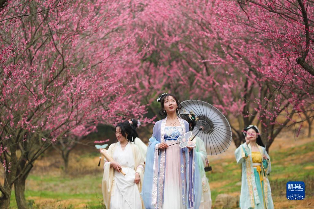 2月19日,游人在浙江省湖州市德清縣下渚湖街道上楊村梅花園賞梅踏青。