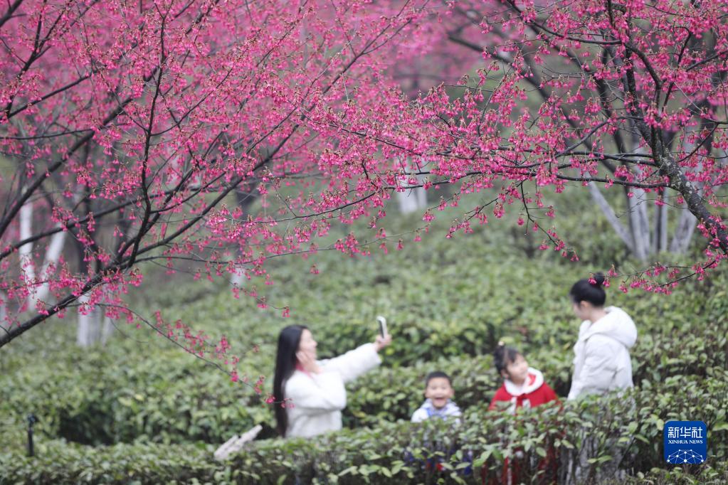 2月19日,在湖南省郴州市蘇仙區飛天山鎮高椅嶺村,游人在茶園賞櫻游玩。