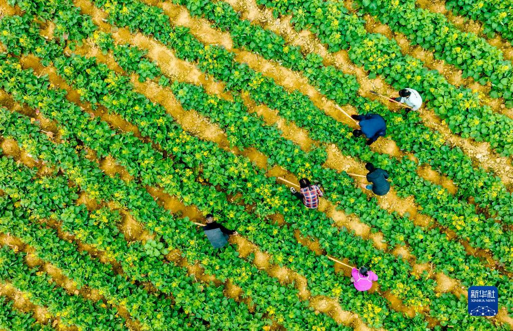2月19日,村民在貴州省黔西市林泉鎮合心村的油菜地里勞作(無(wú)人機照片)。