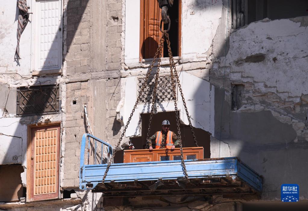 2月18日,在敘利亞哈馬省,工作人員從地震受損建筑中轉移家具。