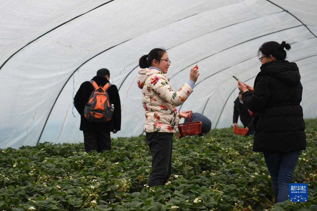 2月18日,孩子和家長(cháng)在馬郢社區采摘草莓。