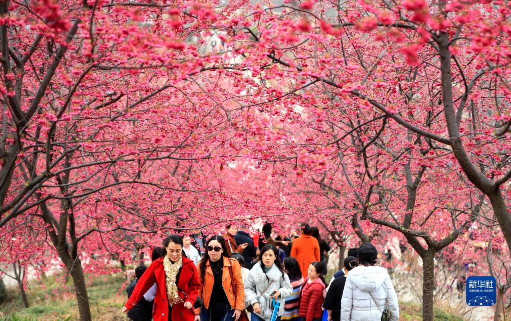2月19日,游客在四川省瀘州市江陽(yáng)區丹林鎮建設村櫻花谷景區游玩。