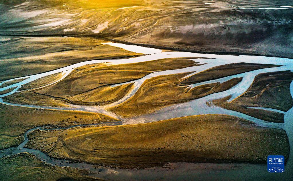 2月19日,在黃河流域的陜西省渭南市合陽(yáng)段拍攝的黃河灘涂美景(無(wú)人機照片)。