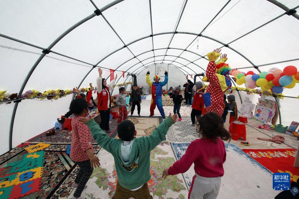 2月19日,在土耳其南部卡赫拉曼馬拉什省卡赫拉曼馬拉什市,孩子們在居民安置點(diǎn)做游戲。