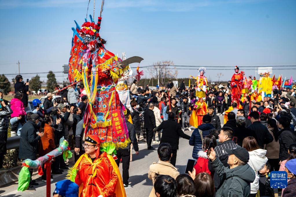 2月19日,西安市臨潼區櫟陽(yáng)街道卷子村村民在村頭巡回表演“背芯子”。