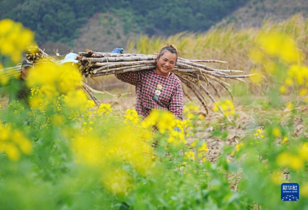 2月19日,在廣西柳州市融水苗族自治縣融水鎮下廓村中麻屯,村民搬運糖料蔗。
