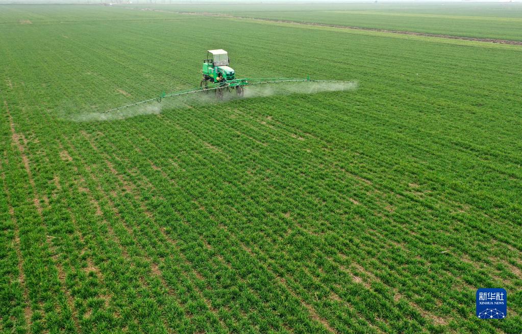 2月18日,安徽省蒙城縣小辛集鄉農民利用自走式噴霧機為小麥噴灑防治病蟲(chóng)害藥物(無(wú)人機照片)。