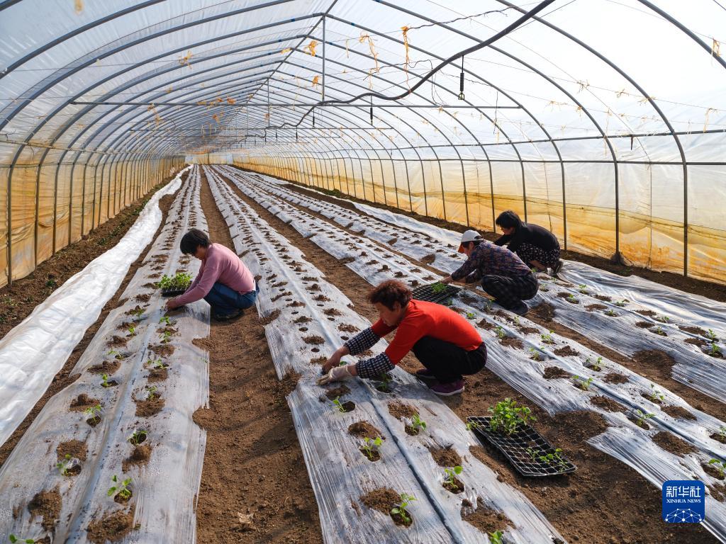 2月19日,在安徽省蚌埠市五河縣頭鋪鎮方臺村,菜農在大棚里種植香瓜苗。