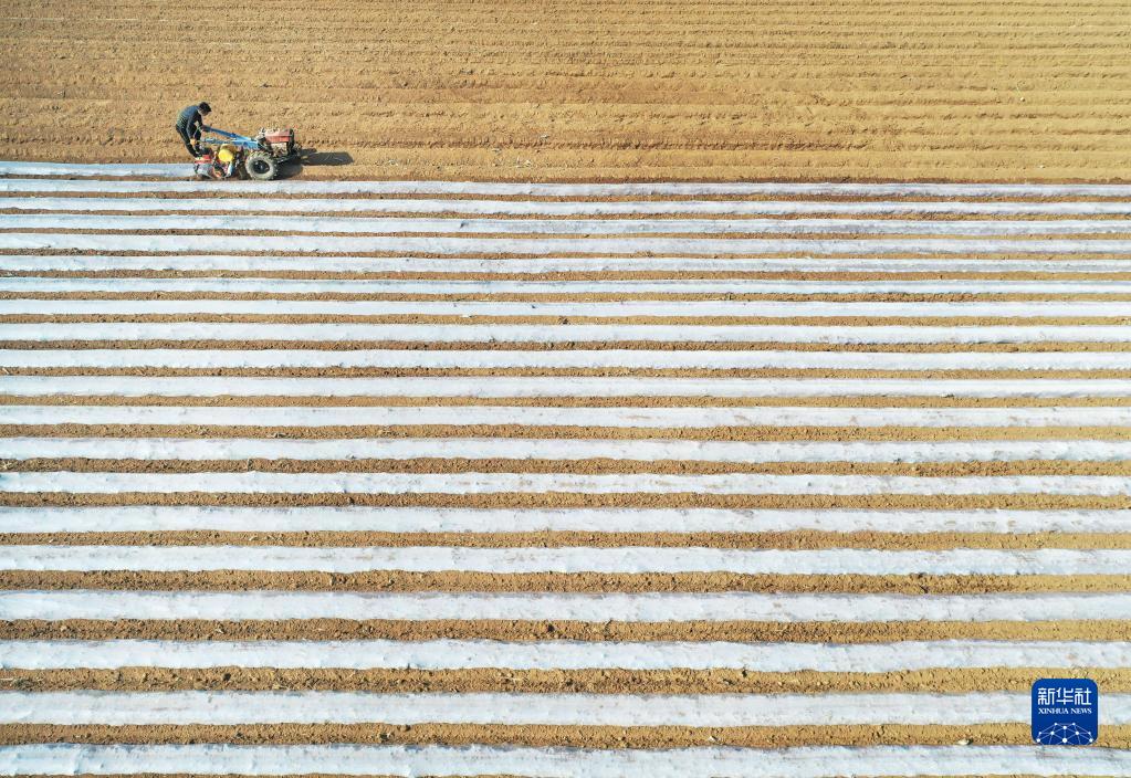 2月20日,山東棗莊山亭區城頭鎮夏莊村農民駕駛農機在田間覆膜播種馬鈴薯(無(wú)人機照片)。