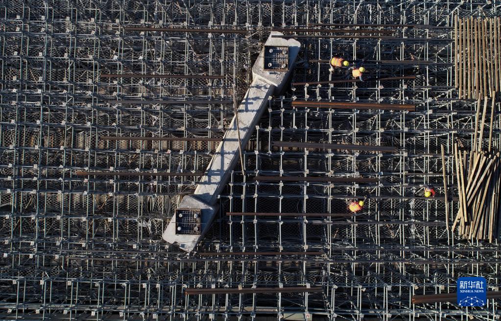 2月20日,中交路橋建設有限公司的工人在石家莊市新華區境內的北三環(huán)市政化改造項目建設工地施工(無(wú)人機照片)。
