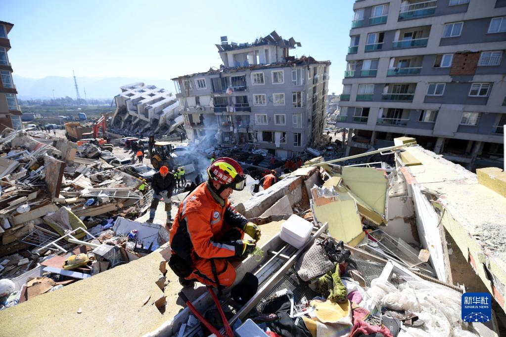 2月9日,中國救援隊在土耳其哈塔伊省安塔基亞市一處受損建筑物參與地震救援工作。