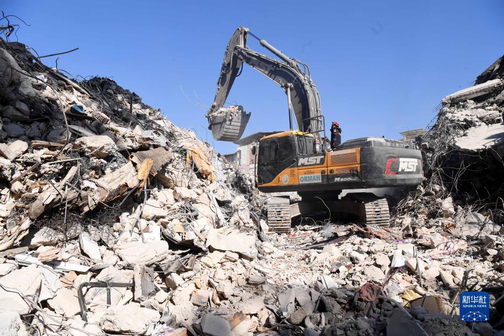2月14日,救援人員操作機械在土耳其哈塔伊省安塔基亞市開(kāi)展地震救援工作。