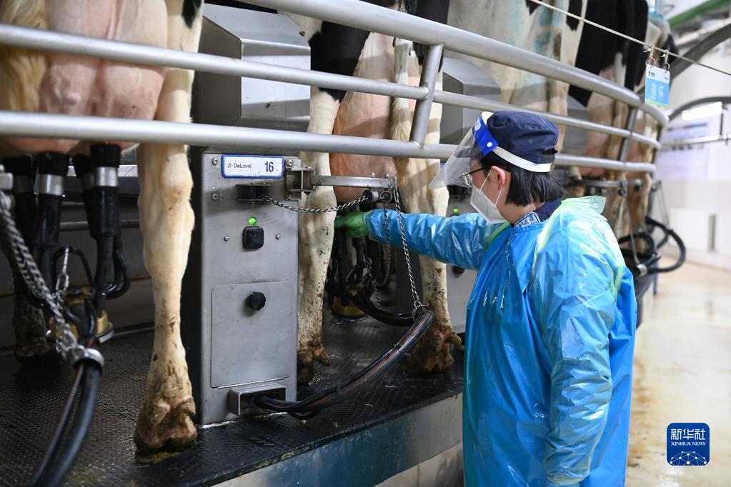 在武威市涼州區一家企業(yè)牧場(chǎng),工作人員在轉盤(pán)式擠奶機旁工作(2月18日攝)。
