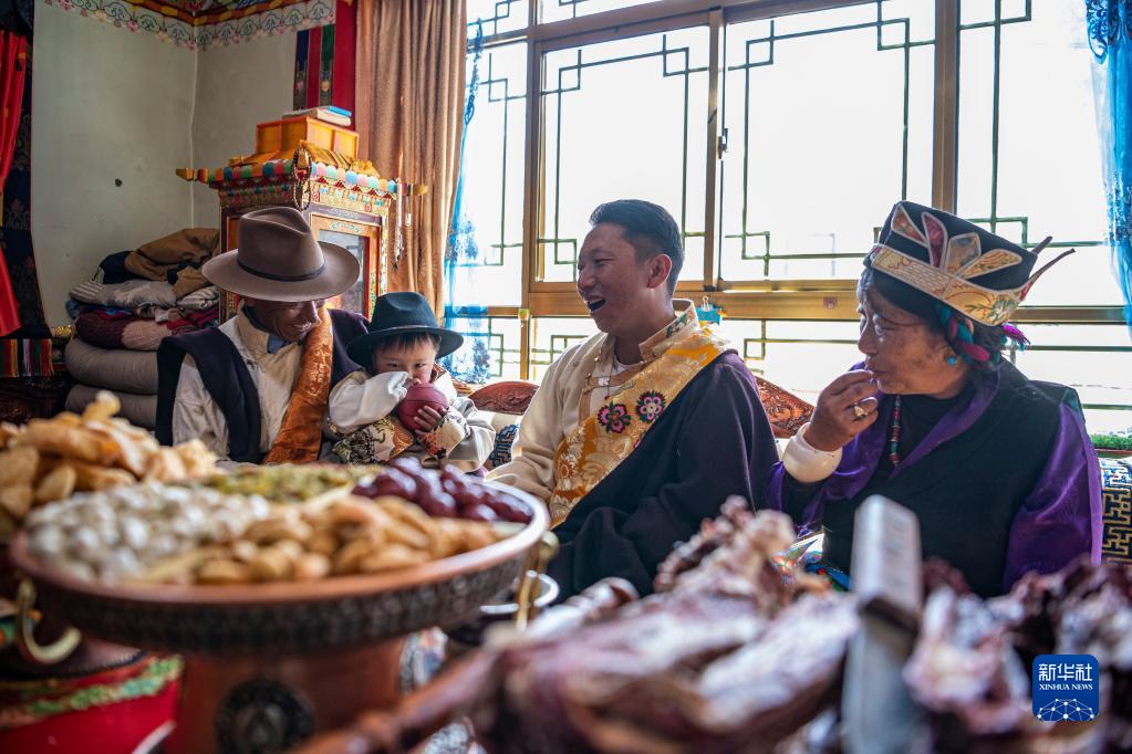 2月20日,在位于西藏拉薩市墨竹工卡縣門(mén)巴鄉的家中,扎西次仁(左一)一家在聊天、享用美食。
