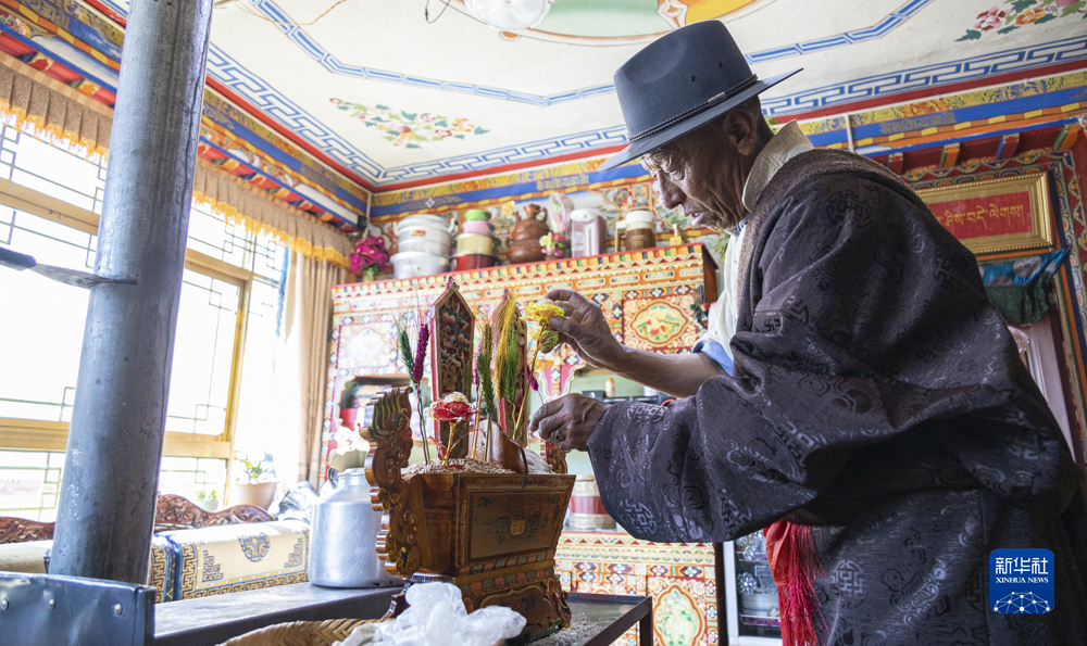 2月20日,在位于西藏拉薩市墨竹工卡縣門(mén)巴鄉的家中,扎西次仁用五彩青稞穗裝點(diǎn)象征吉祥的“切瑪”。
