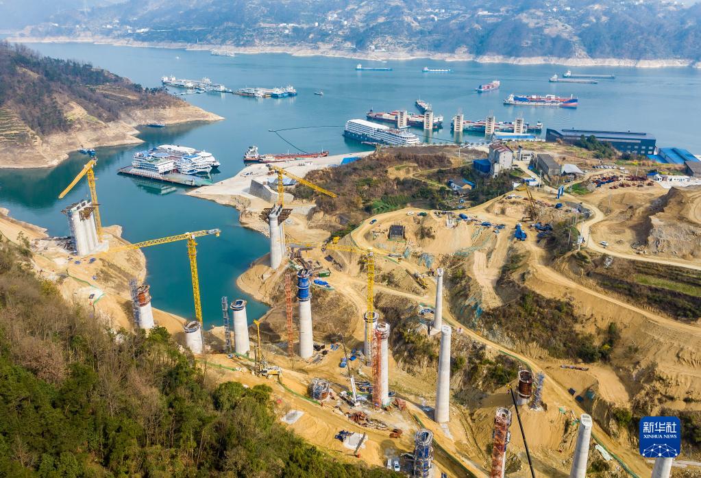 2月20日,工人在三峽庫區湖北省宜昌市秭歸縣三峽樞紐茅坪港疏港鐵路建設工地施工(無(wú)人機照片)。