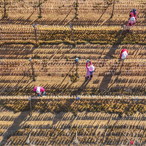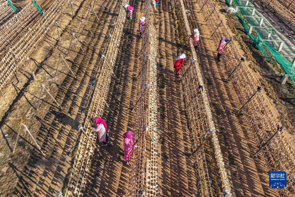 2月20日,在榮成市靖海灣畔一處晾曬場(chǎng),漁民在晾曬魷魚(yú)(無(wú)人機照片)。