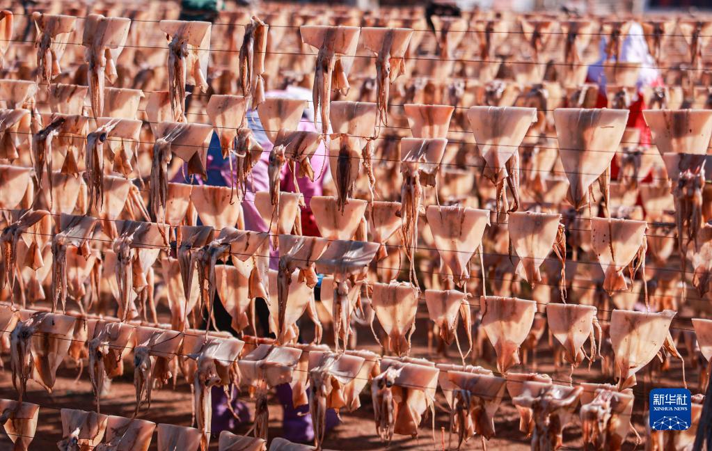 近日,山東省榮成市靖海灣畔的漁民利用晴好天氣,在晾曬場(chǎng)抓緊晾曬魷魚(yú),鋪展開(kāi)一幅春日“曬鮮圖”。近年來(lái),當地漁民通過(guò)電商平臺將魷魚(yú)干制品銷(xiāo)往各地市場(chǎng)。