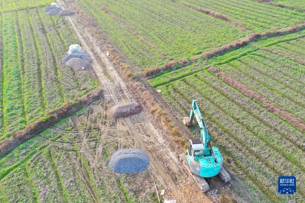 2月20日,施工人員在湖南省永州市道縣清塘鎮樓田村修建灌溉水渠(無(wú)人機照片)。