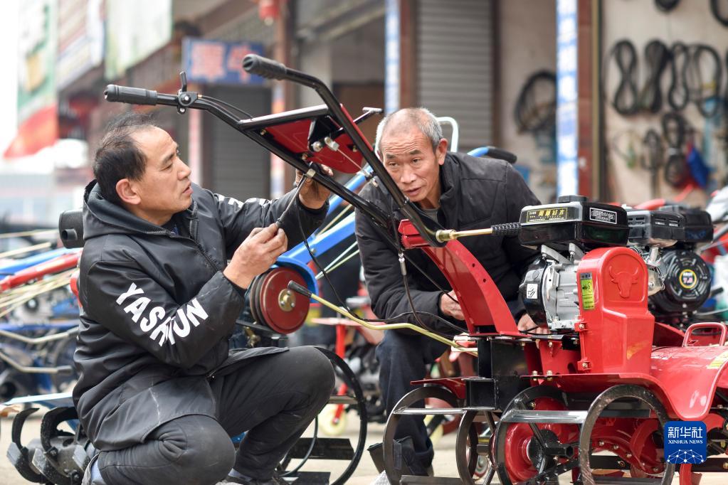 工人在湖南省婁底市雙峰縣五里牌農機大市場(chǎng)裝配調試微型耕耘機,準備交給購買(mǎi)的農民(2月18日攝)。