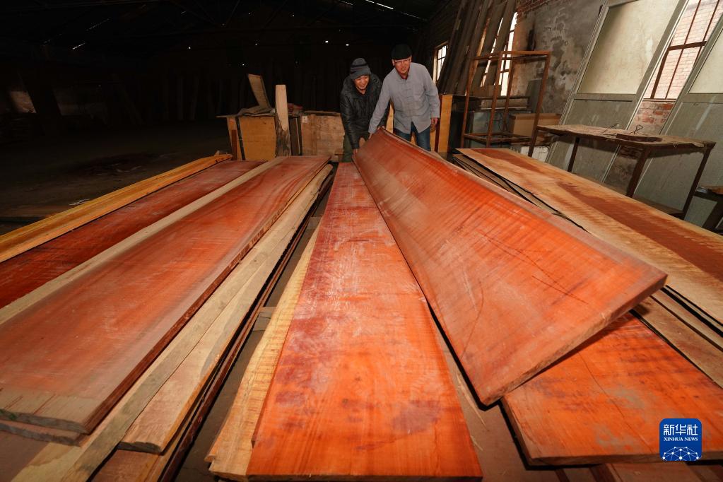 2月20日,陶笛藝人侯義敏(右)挑選制作木質(zhì)陶笛的木材。