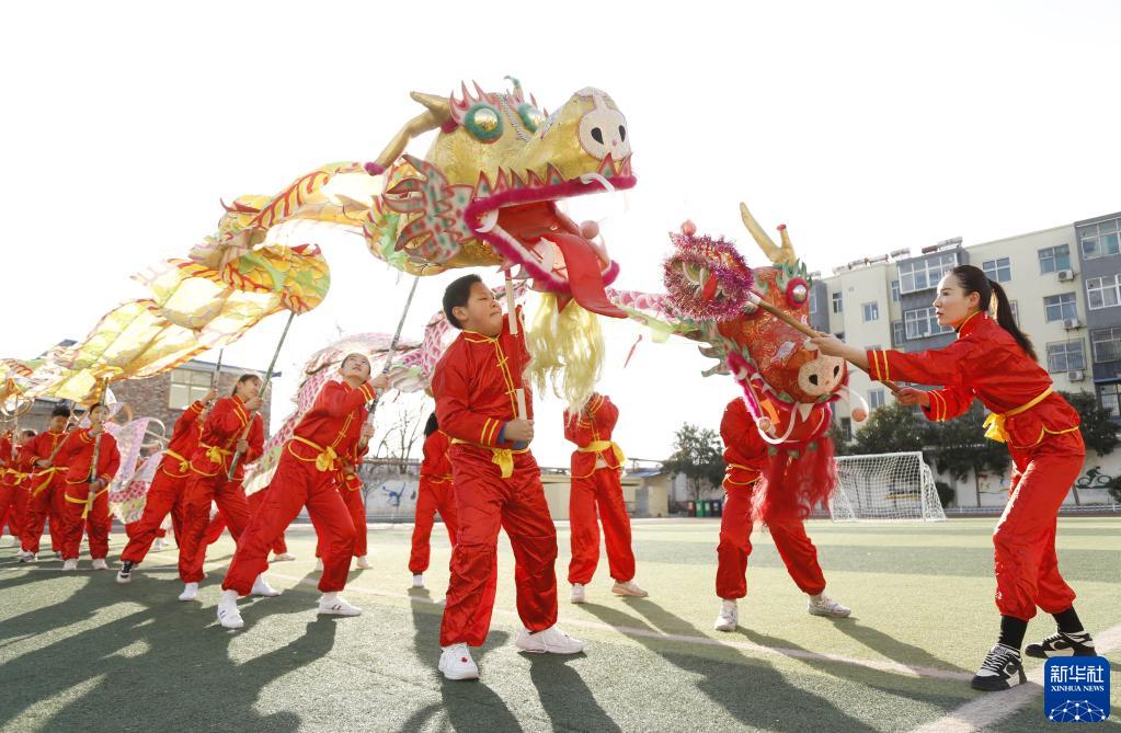 2月21日,河北省邢臺市東牛角小學(xué)學(xué)生在表演舞龍。