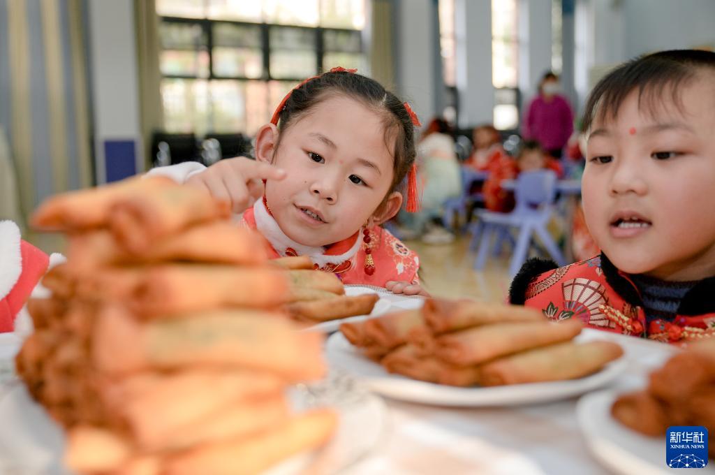 2月21日,安徽省合肥市蜀山區南崗鎮惠民新村幼兒園的小朋友們參加“吃龍鱗”活動(dòng)。