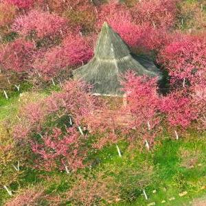 2月21日,游客在常寧市羅橋鎮廟山村櫻花園賞櫻游玩(無(wú)人機照片)。