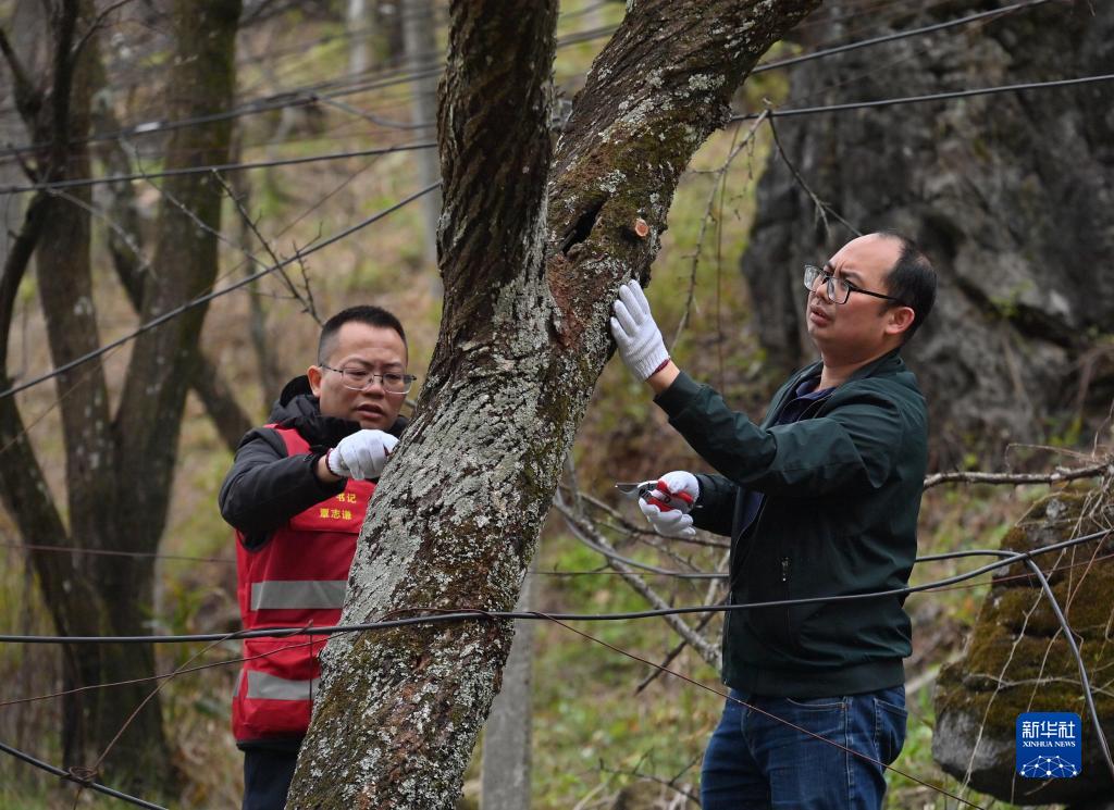 2月21日,在融安縣東起鄉銅板屯,林業(yè)技術(shù)人員和駐村第一書(shū)記在管護老李樹(shù)。