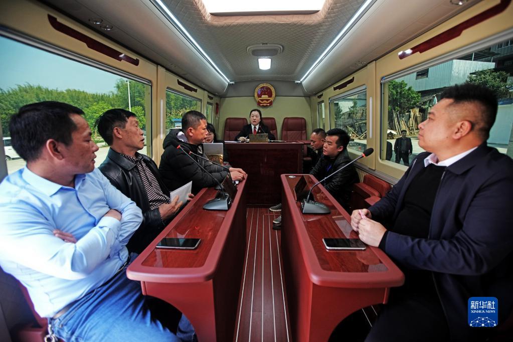 2月20日,在廣西柳州市融水苗族自治縣融水鎮新安村,訴前調解在巡回審判車(chē)內進(jìn)行。