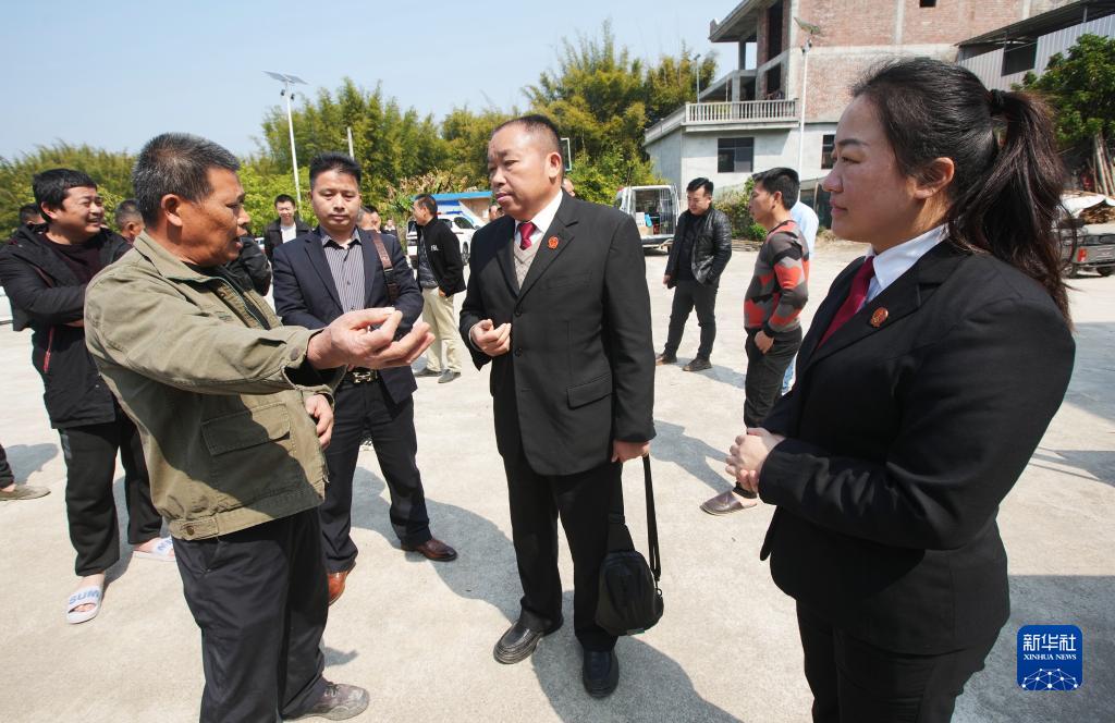 2月20日,在廣西柳州市融水苗族自治縣融水鎮新安村,原告之一(前左一)向法官反映自己的訴求。