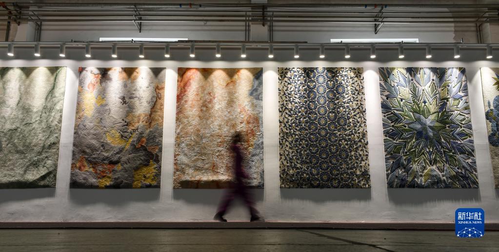 2月21日,在西寧市圣源地毯集團有限公司生產(chǎn)車(chē)間,一名操作工走過(guò)藏毯展示區。