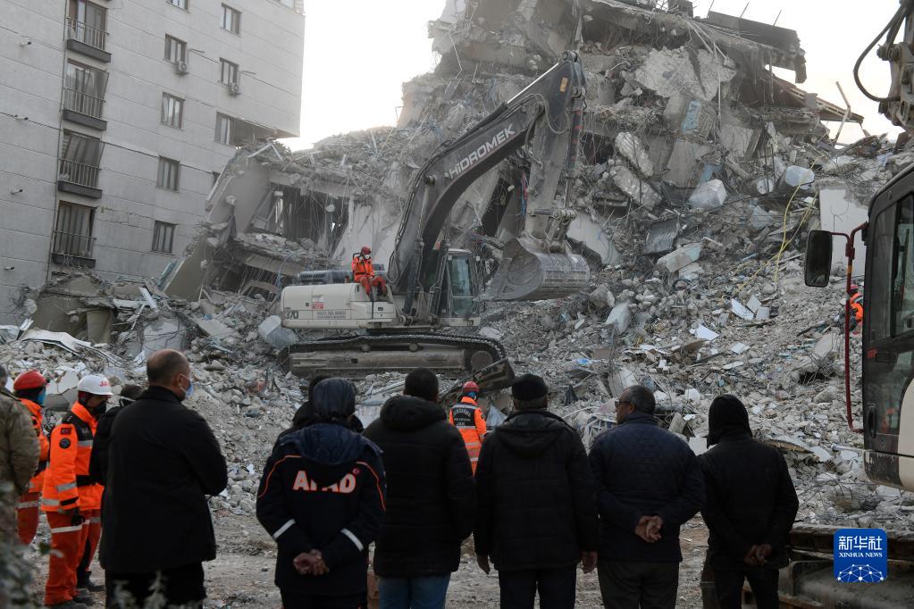 2月21日,工作人員利用大型機械在土耳其哈塔伊省清理廢墟。